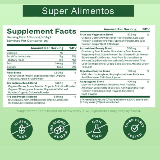 Espinaca, alfalfa, col rizada, chlorella, espirulina, fibra de manzana, jengibre, té verde, cúrcuma, extracto de frutas, enzimas digestivas, probióticos vivos ¡y mucho más!